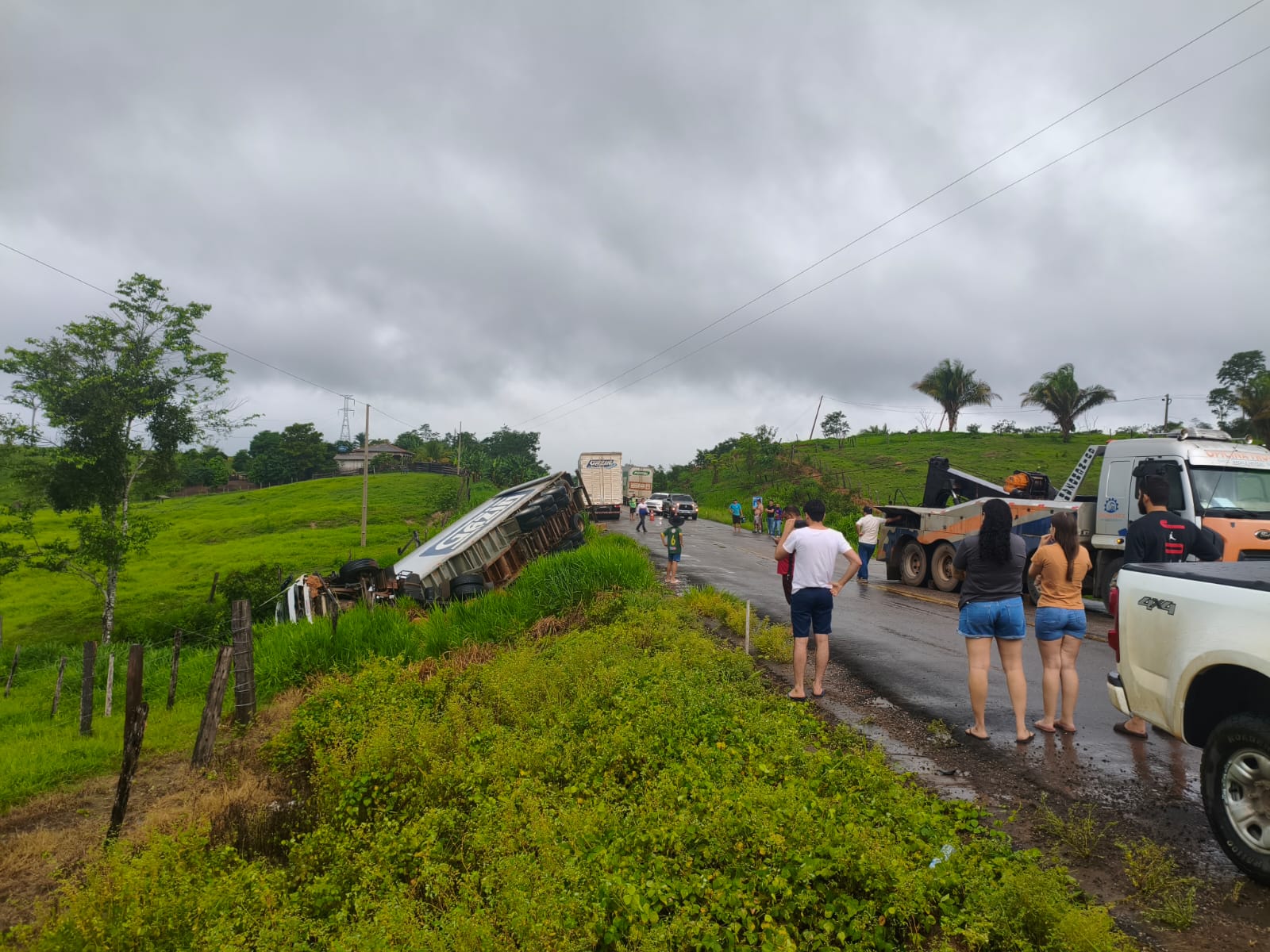 Um vídeo que circula nas redes sociais mostra o veículo tombado fora da pista, enquanto motoristas que passavam pelo local registravam o ocorrido.