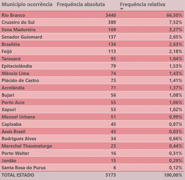 Segundo o levantamento, 66,5% dos registros foram feitos em Rio Branco, o que representa mais de dois terços de todas as ocorrências do estado. Em seguida aparecem Cruzeiro do Sul, com 7,52%, e Sena Madureira, com 3,27%. O restante está distribuído em proporções menores entre os demais municípios acreanos.