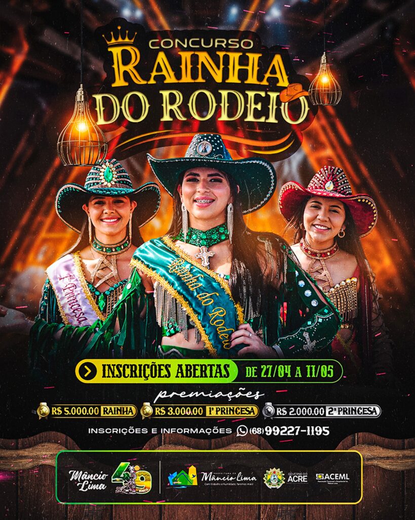 A tradição, o brilho e a força da cultura sertaneja já têm data marcada para ganhar destaque em Mâncio Lima. Estão abertas as inscrições para o aguardado Concurso Rainha do Rodeio, um dos momentos mais emblemáticos das festividades que celebram o universo country na região e no aniversário da cidade.