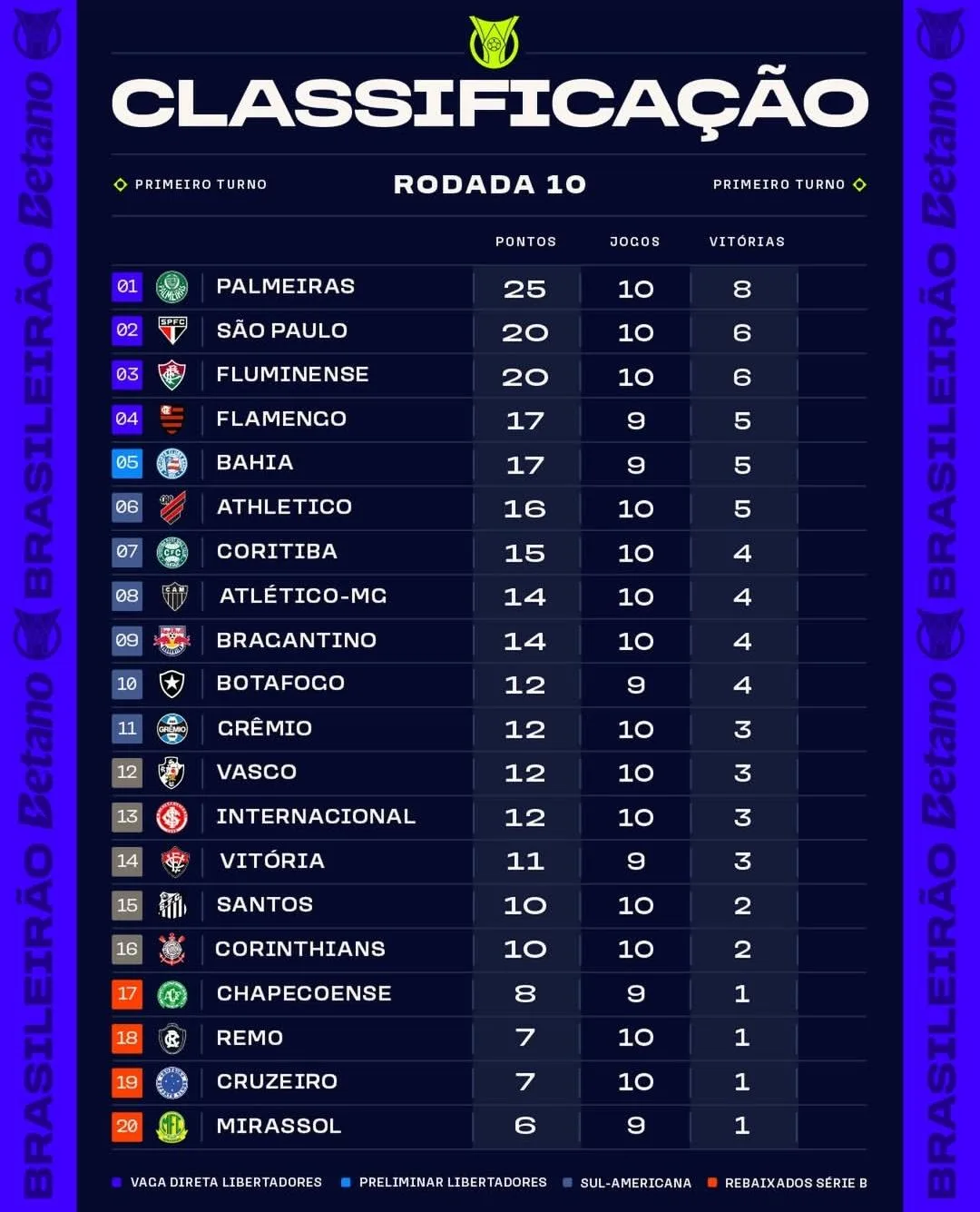 A décima rodada do Brasileirão 2026 terminou na noite deste domingo. Com a derrota por 3 a 1 diante do Flamengo, no Maracanã, o Santos terminou a rodada na 15ª colocação na classificação, com apenas dez pontos ganhos.