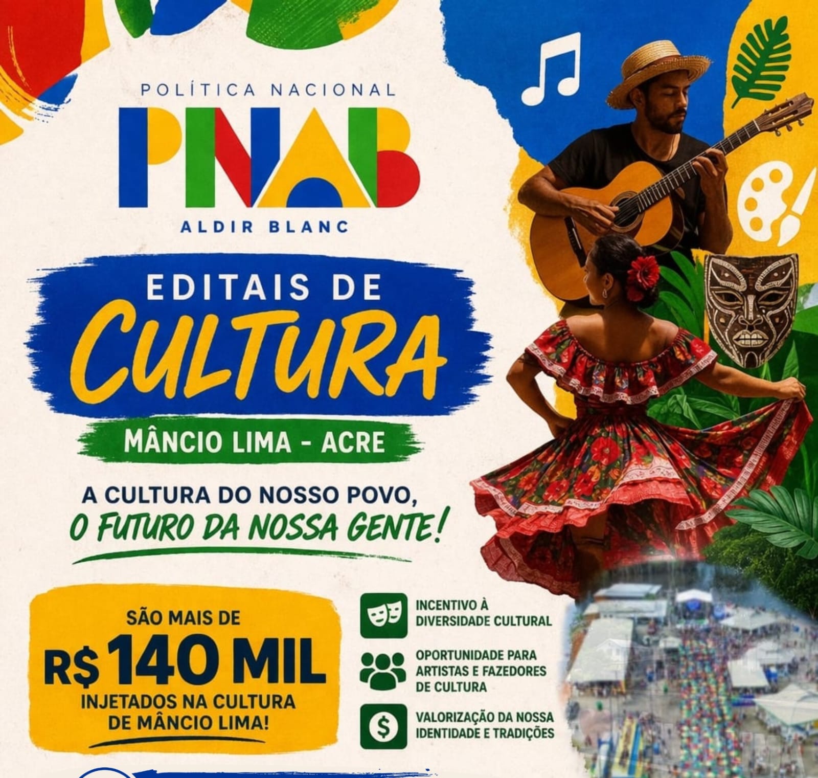 A Prefeitura de Mâncio Lima, no Acre, anunciou a abertura de novos editais culturais por meio da Política Nacional Aldir Blanc (PNAB), reforçando o compromisso com o fortalecimento da cultura local.