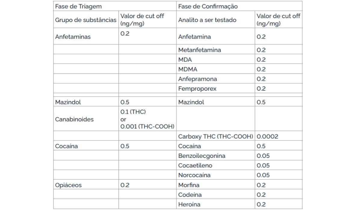 O exame toxicológico é capaz de identificar cinco grupos de substâncias, incluindo opiáceos (como morfina e codeína), cocaína, anfetaminas, canabinoides e derivados de heroína. A presença de qualquer uma delas dentro da janela de detecção pode impedir a emissão ou renovação da CNH.
