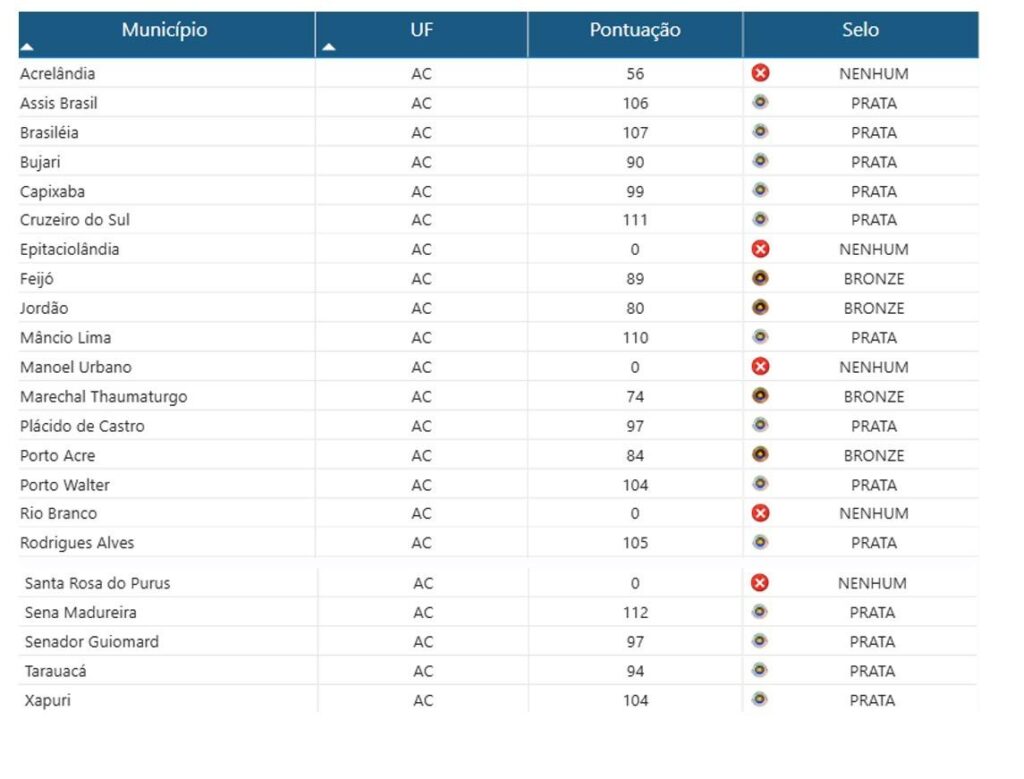 De acordo com a pontuação divulgada, Mâncio Lima aparece entre os destaques estaduais, ao lado de municípios como Sena Madureira (112 pontos) e Cruzeiro do Sul (111 pontos), superando a marca de 100 pontos exigida para a certificação Prata.