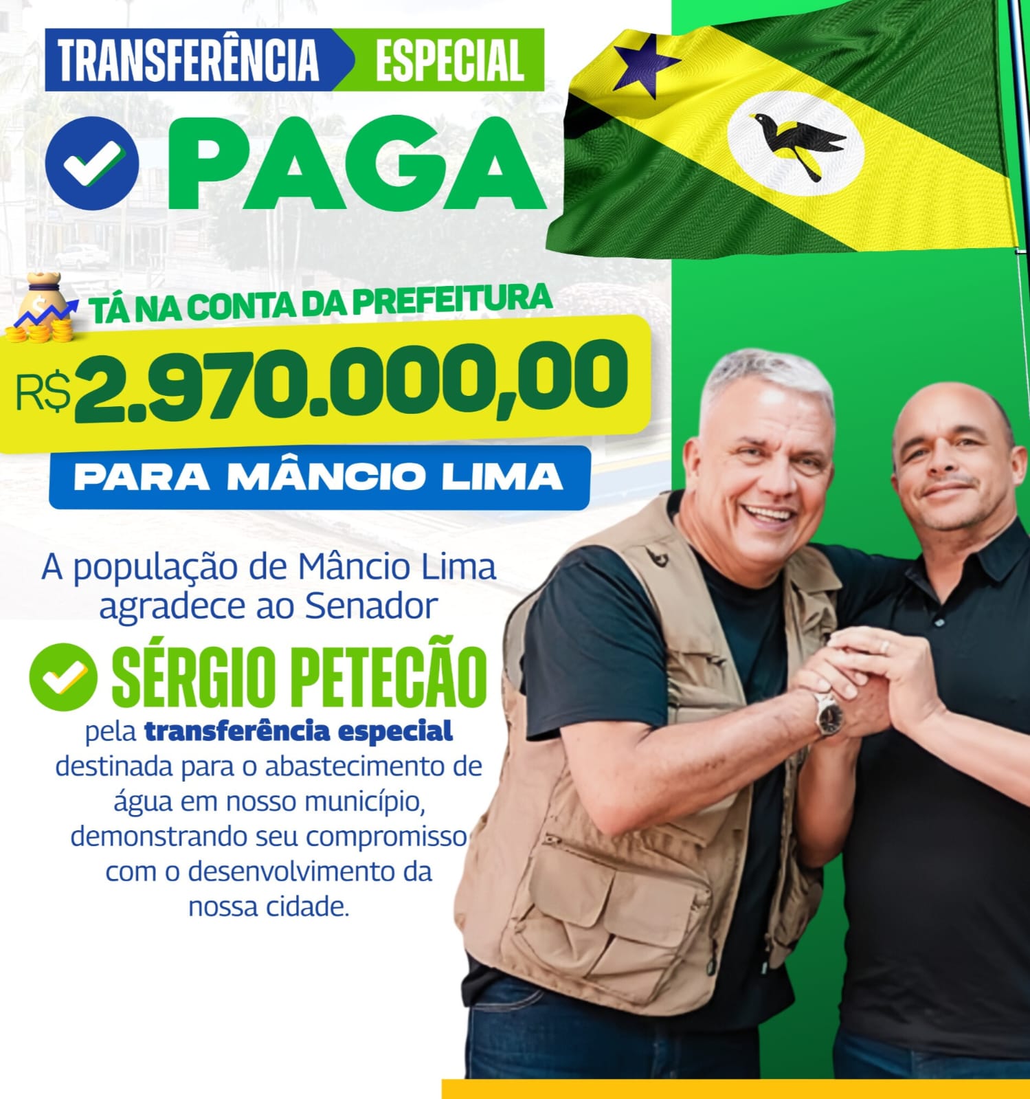 “Essa transferência representa um avanço importante para Mâncio Lima. Água é essencial para a vida e para o bem-estar das famílias. Agradeço ao senador Sérgio Petecão por essa parceria que vem fortalecendo nosso município.”