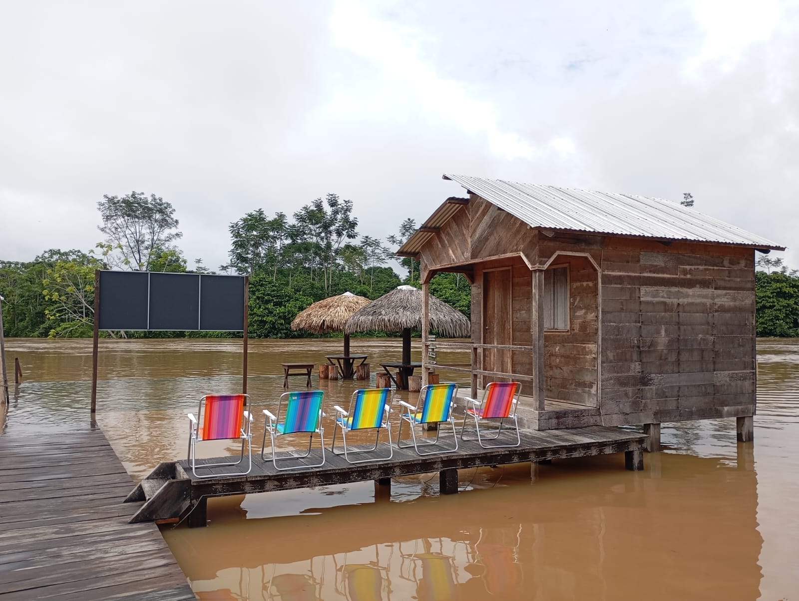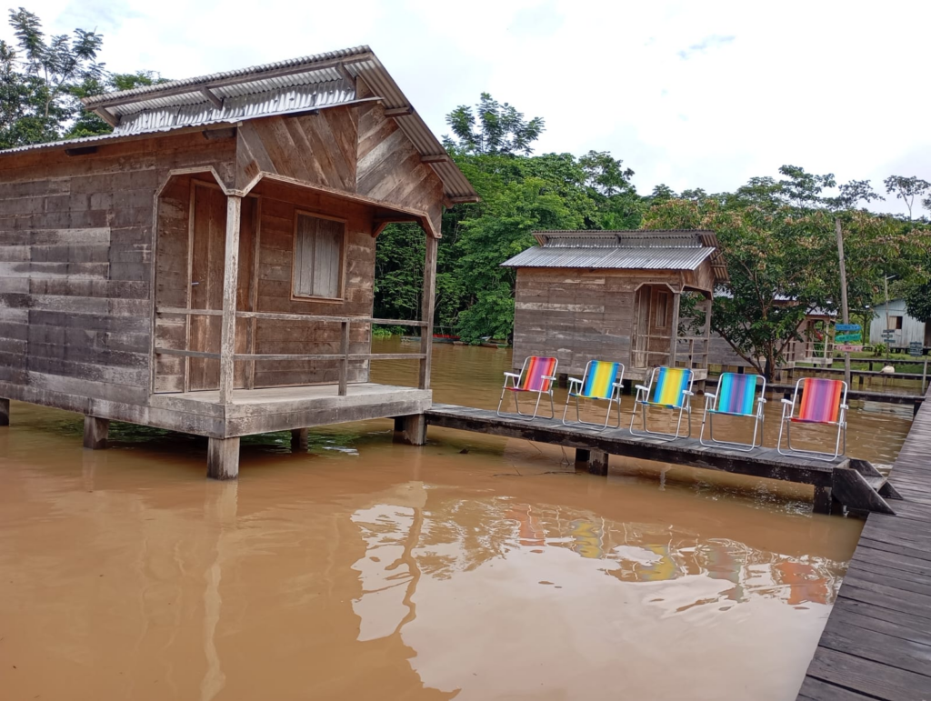 A Pousada Caminho das Cachoeiras já está sendo diretamente afetada pela enchente. Parte da estrutura do local encontra-se quase submersa, e em alguns chalés a água já invadiu os recintos. O deck da pousada foi completamente tomado pelas águas do rio, demonstrando a intensidade da subida do nível.
