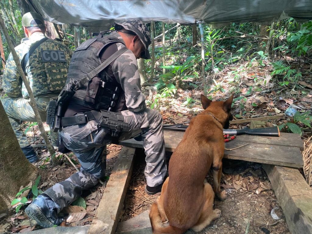 Durante o patrulhamento e incursão em área de mata, as equipes identificaram um abrigo improvisado (tapiri). Ao perceber a presença dos policiais, um indivíduo que estava no local empreendeu fuga. Foi então empregado o cão policial K-9 Thor, especializado na detecção de armas e entorpecentes, que sinalizou positivamente para um ponto próximo ao abrigo.