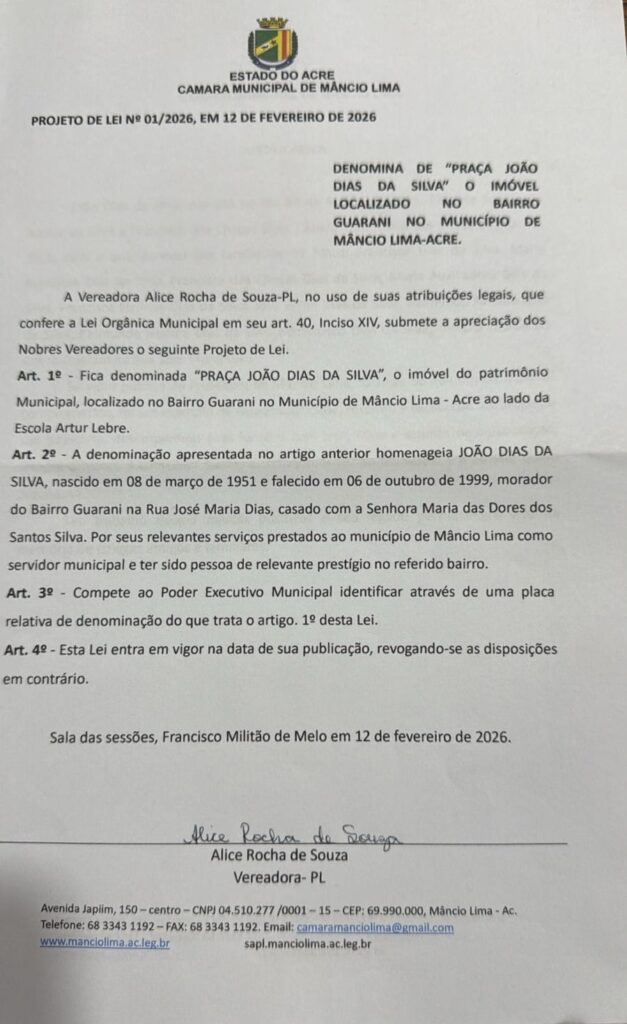 A Câmara Municipal de Mâncio Lima analisa um projeto de lei que propõe a mudança do nome da praça localizada no bairro Guarani. A proposta é denominar o espaço público como Praça João Dias da Silva, em homenagem a um morador tradicional da comunidade.