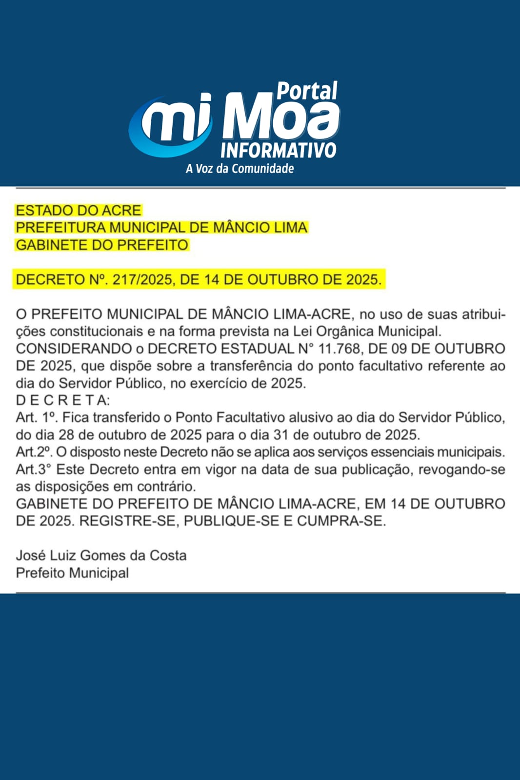 A Prefeitura de Mâncio Lima publicou, nesta segunda-feira (14), o Decreto Municipal nº 217/2025, que transfere o ponto facultativo alusivo ao Dia do Servidor Público, tradicionalmente comemorado em 28 de outubro, para a sexta-feira, dia 31 de outubro de 2025.