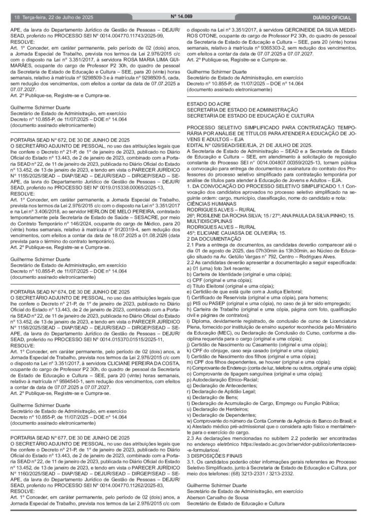 Mais convocações nesta terça-feira, 22, no Diário Oficial do Estado (DOE). O governo do Acre publicou edital que convoca candidatos aprovados no processo seletivo simplificado para a Educação de Jovens e Adultos (EJA) para entrega de documentos e assinatura de contrato temporário.