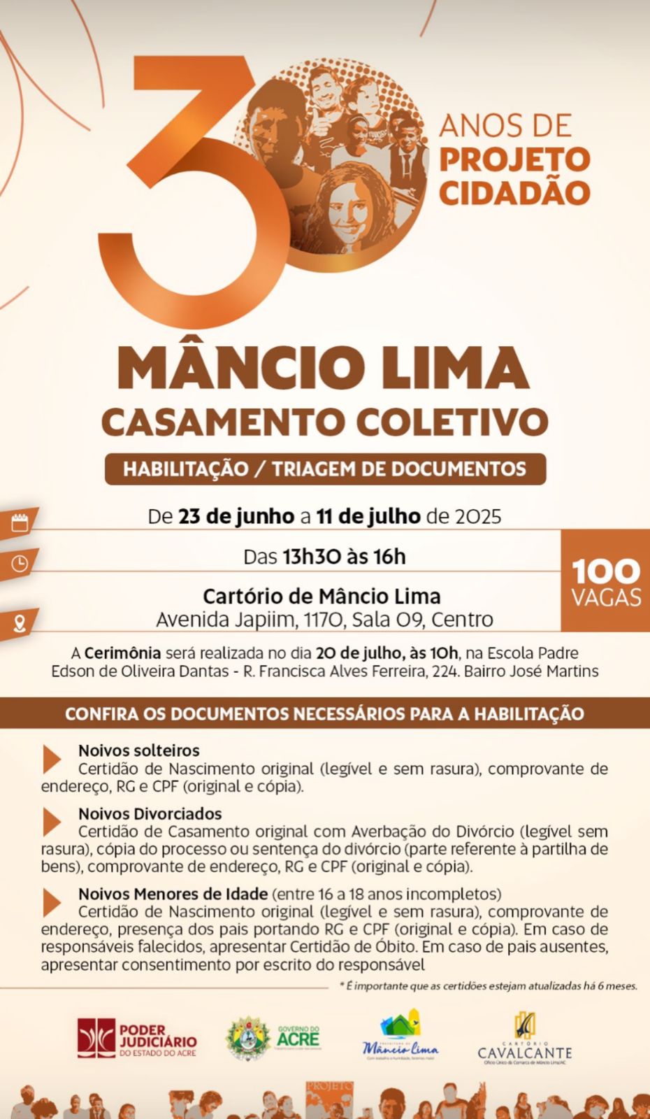 Celebrando os 30 anos do Projeto Cidadão, o Poder Judiciário do Acre, em parceria com o Governo do Estado, a Prefeitura de Mâncio Lima e o Cartório Cavalcante, realiza mais uma edição do casamento coletivo gratuito no município de Mâncio Lima. A ação social visa garantir cidadania e dignidade a casais que desejam oficializar a união.