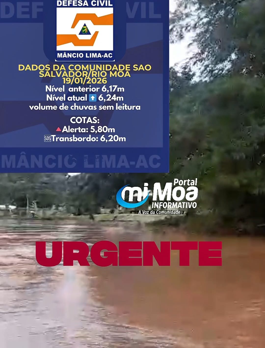 O Rio Moa ultrapassou a cota de transbordamento na manhã desta segunda-feira (19), conforme boletim divulgado pela Defesa Civil de Mâncio Lima. A medição realizada na Comunidade São Salvador apontou que o nível do rio chegou a 6,24 metros, acima da cota de transbordo, que é de 6,20 metros.