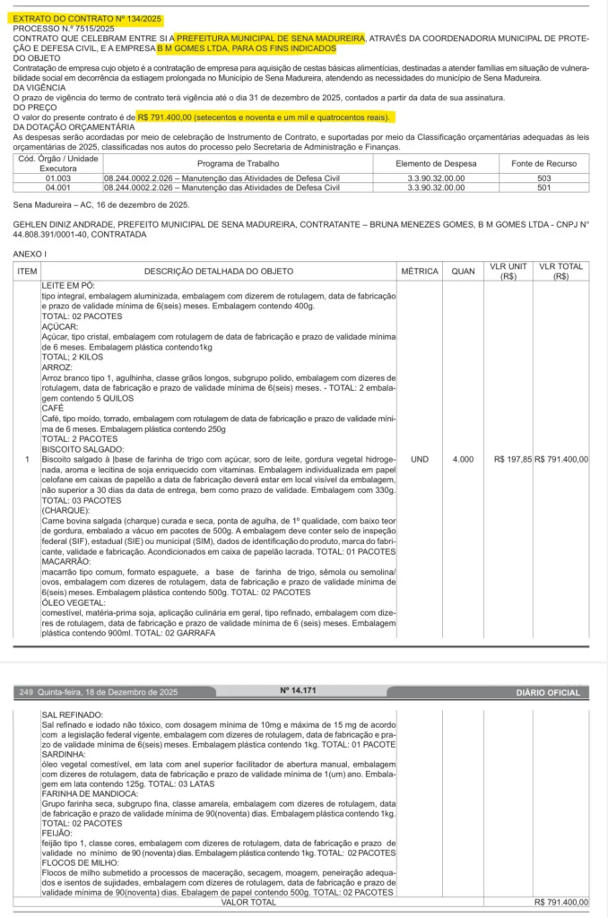 Outro fato que chamou a atenção de internautas que procuraram a reportagem do ContilNet é a dispensa de licitação no valor de R$ 791.400,00 (setecentos e noventa e um mil e quatrocentos reais) que o prefeito publicou no Diário Oficial do Estado (DOE) no último dia 16 de dezembro, para adquirir cestas básicas, sob o pretexto de “atender famílias em situação de vulnerabilidade social em decorrência da estiagem prolongada no município de Sena Madureira”.