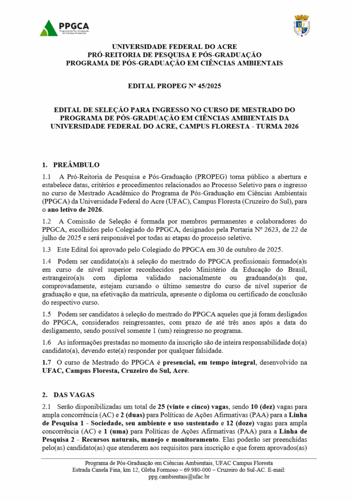 A Universidade Federal do Acre (Ufac), por meio da Pró-Reitoria de Pesquisa e Pós-Graduação (Propeg), publicou nesta terça-feira, 18, o Edital PROPEG nº 45/2025, que regulamenta o processo seletivo para ingresso no Mestrado em Ciências Ambientais (PPGCA) do Campus Floresta, em Cruzeiro do Sul (AC). As inscrições para a turma de 2026 estarão abertas entre 19 de dezembro de 2025 e 30 de janeiro de 2026, exclusivamente pela plataforma digital da instituição.