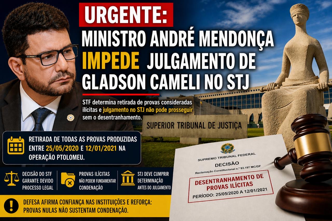 Uma decisão do ministro André Mendonça, do Supremo Tribunal Federal (STF), publicada nesta terça-feira (14), mudou o rumo do julgamento do ex-governador do Acre, Gladson Cameli, que estava previsto para ser retomado nesta quarta-feira (15) no Superior Tribunal de Justiça (STJ).