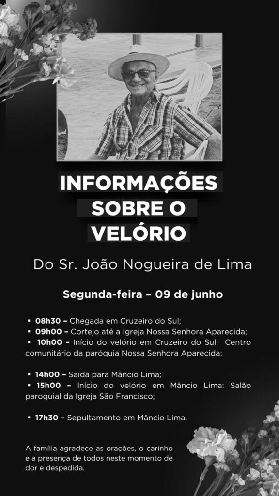 O corpo do senhor João Nogueira de Lima, pai do prefeito de Cruzeiro do Sul, Zequinha Lima, será velado nesta segunda-feira (9) em dois momentos, sendo o último em sua terra natal, o município de Mâncio Lima, onde também ocorrerá o sepultamento.